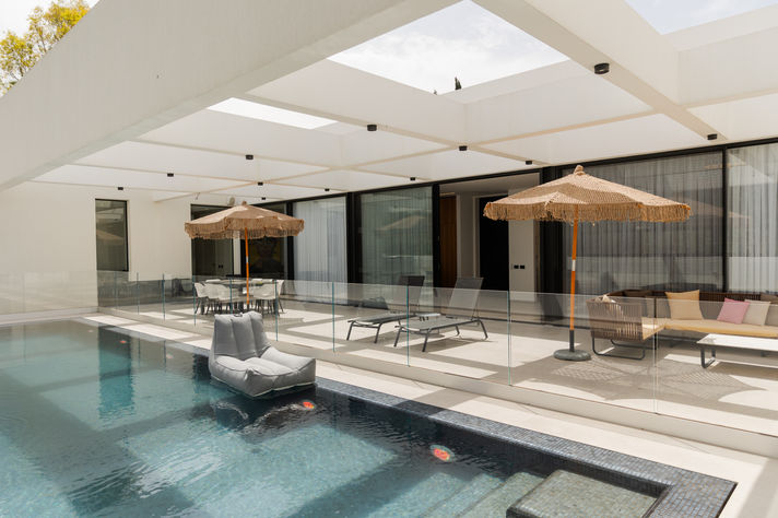 הבריכה מוקפת בגדר זכוכית שקופה לבטיחות מירבית עם נעילה פנימית , קיפצו פנימה להתרעננות והשתזפו בשמש.